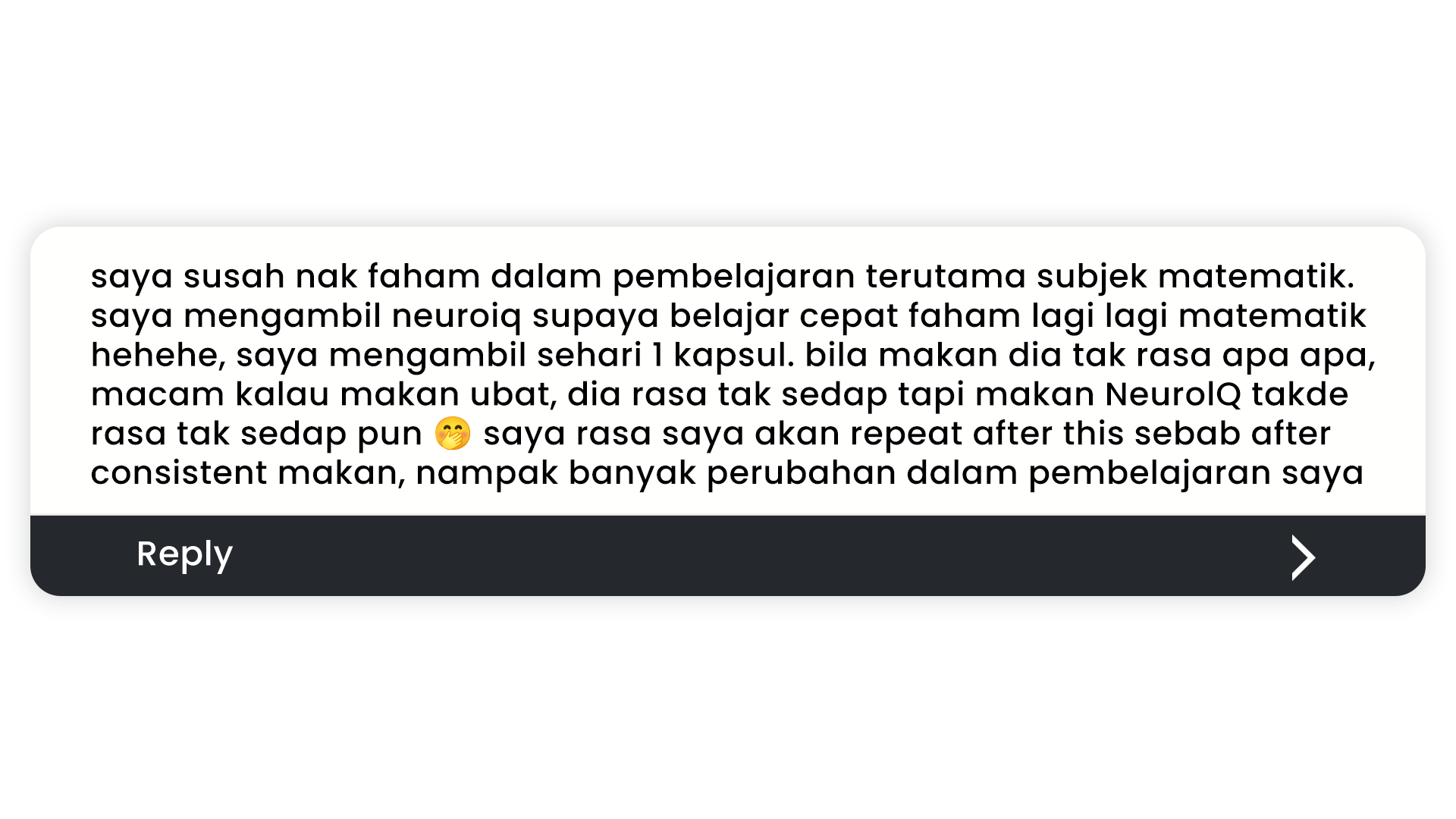 "saya susah nak faham dalam pembelajaran terutama subjek matematik. saya mengambil neuroiq supaya belajar cepat faham lagi lagi matematik hehehe, saya mengambil sehari 1 kapsul. bila makan dia tak rasa apa apa, macam kalau makan ubat, dia rasa tak sedap tapi makan NeurolQ takde rasa tak sedap pun saya rasa saya akan repeat after this sebab after consistent makan, nampak banyak perubahan dalam pembelajaran saya"