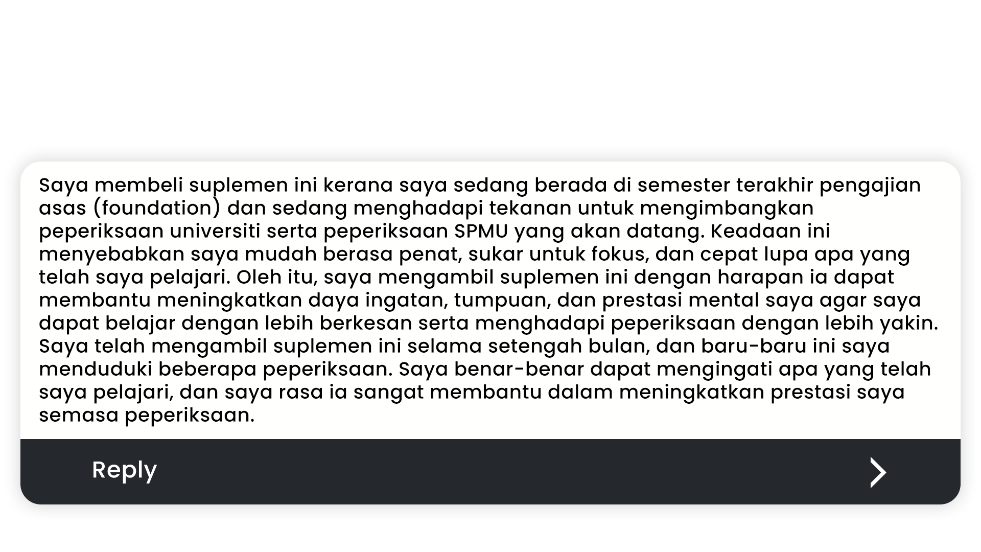 "Saya membeli suplemen ini kerana saya sedang berada di semester terakhir pengajian asas (foundation) dan sedang menghadapi tekanan untuk mengimbangkan peperiksaan universiti serta peperiksaan SPMU yang akan datang. Keadaan ini menyebabkan saya mudah berasa penat, sukar untuk fokus, dan cepat lupa apa yang telah saya pelajari. Oleh itu, saya mengambil suplemen ini dengan harapan ia dapat membantu meningkatkan daya ingatan, tumpuan, dan prestasi mental saya agar saya dapat belajar dengan lebih berkesan serta menghadapi peperiksaan dengan lebih yakin. Saya telah mengambil suplemen ini selama setengah bulan, dan baru-baru ini saya menduduki beberapa peperiksaan. Saya benar-benar dapat mengingati apa yang telah saya pelajari, dan saya rasa ia sangat membantu dalam meningkatkan prestasi saya semasa peperiksaan.