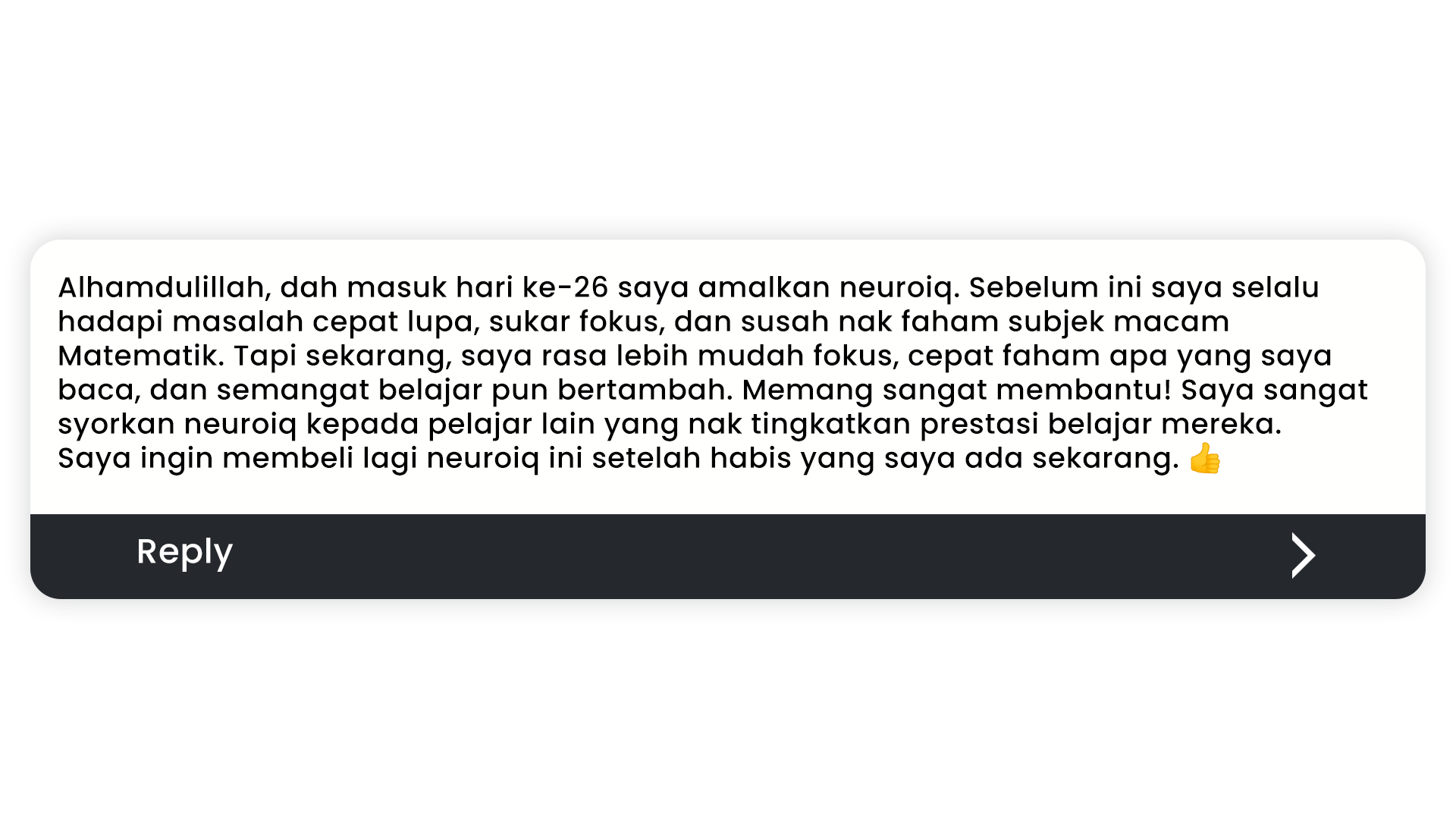 "Alhamdulillah, dah masuk hari ke-26 saya amalkan neuroiq. Sebelum ini saya selalu hadapi masalah cepat lupa, sukar fokus, dan susah nak faham subjek macam Matematik. Tapi sekarang, saya rasa lebih mudah fokus, cepat faham apa yang saya baca, dan semangat belajar pun bertambah. Memang sangat membantu! Saya sangat syorkan neuroiq kepada pelajar lain yang nak tingkatkan prestasi belajar mereka. Saya ingin membeli lagi neuroiq ini setelah habis yang saya ada sekarang."